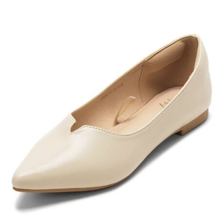 ヒールなしでも美脚に見えるポインテッドトゥパンプス。