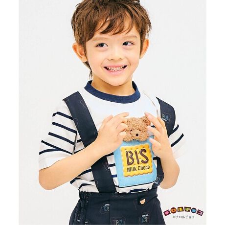 ≪子供服 apres les coursの 『チロルチョコ』コレクション≫チロルチョコとtiny bearモチーフがとってもキュートなコラボTシャツが登場♪ネイビーは青の『ビス』、レッドは『コーヒーヌガー』モチーフのポケットから、tiny bear(or くまさん)のぬいぐるみがひょっこり!細めのボーダー柄でカジュアルな雰囲気に◎オフホワイトはカラフルな『ビス』を持ったくまさんが並んだデザインで、刺繍の縁取りやリボンがこだわりポイント♪バックにもチロルチョコデザインのワンポイント入り!どのカラーも、男の子も女の子も着られるデザインです。おともだちやきょうだいとお揃いで着ていただくのはもちろん、プレゼントにも最適◎