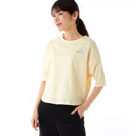 ONELINEコレクションから、コットンポリエステルのPUMA MIX CLOTH素材を使用したTシャツです。ゆったりとしたリラックスフィット。裾にテールがついたデザインのボクシーなシルエットで、透け感を演出しする背面に入ったパワーメッシュのラインがフェミニンな印象に。カジュアルなボトムスとの相性抜群で、スポーティなカジュアルコーディネートを楽しめます。また、快適な着心地を実現する吸湿速乾性に優れたPUMA MIX CLOTH素材を使用しているため、1日中さらっと着用いただけます。