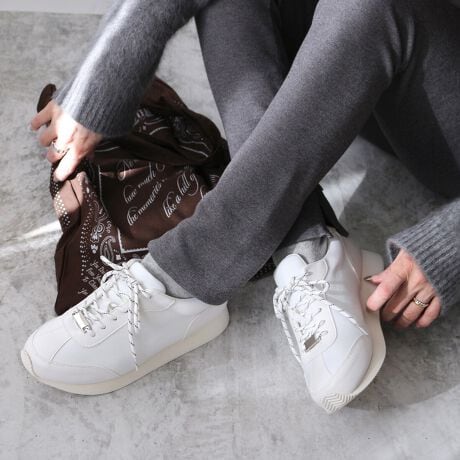 異素材コンビのデザインがパッと目を惹くFin(フィン)のナイロンコンビ厚底スニーカーが登場しました。気軽にいつでも履けるスニーカーは一足は持っておきたい定番アイテム。コードシューレースとシルバーのメタルプレートが足元に程よいアクセントをプラスしてくれます。無地の替え紐がついているので、コーデに合わせて楽しめるのが嬉しいポイント。すらっとしたフォルムで大人の女性も履ける上品なデザイン。