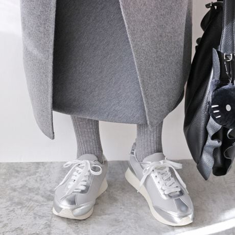 異素材コンビのデザインがパッと目を惹くFin(フィン)のナイロンコンビ厚底スニーカーが登場しました。気軽にいつでも履けるスニーカーは一足は持っておきたい定番アイテム。コードシューレースとシルバーのメタルプレートが足元に程よいアクセントをプラスしてくれます。無地の替え紐がついているので、コーデに合わせて楽しめるのが嬉しいポイント。すらっとしたフォルムで大人の女性も履ける上品なデザイン。