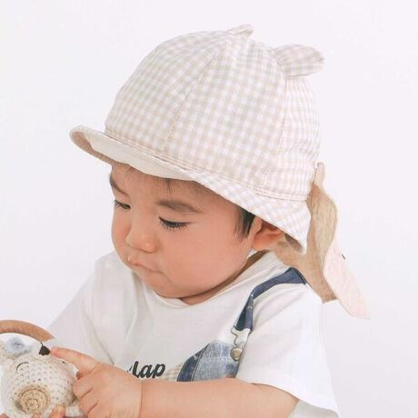 【お揃い/UVカット】ドットストライプチェッククマさん日よけ付きハットベビー(46~48cm)