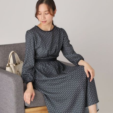 チェーン風の柄が印象的で、衿部分、ウエスト、袖口は配色ニットディテールで引き締めています。