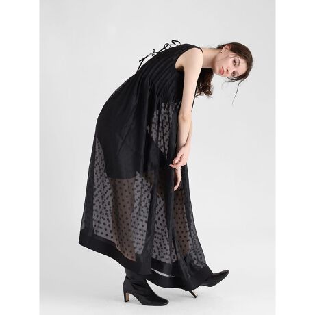 ドット柄の張り感のあるオーガンジー生地で仕上げた、レイヤードスタイルが楽しめるノースリーブワンピース。