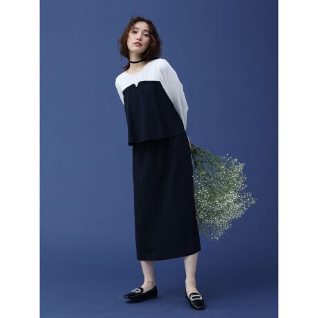 胸元から広がる異素材のペプラムシルエットとツイード生地でトレンド感と上品さを持ち合わせたワンピース。