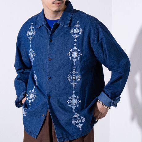 大胆な刺繍プリントが目を惹くデニムシャツ