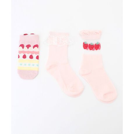 3種類の違う柄の組み合わせソックス。バリエーション豊富でコーディネートに合わせて選ぶのも楽しい、お得な3足セットです。ケーキ、イチゴ、レースデザインと、どの靴下もキュートなデザイン♪普段履きに便利な組み合わせなので、ヘビロテ間違いなしアイテムです。