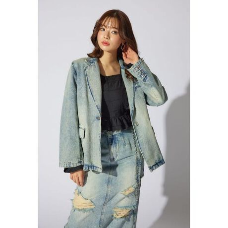 【羽織るだけで旬コーデが完成するデニムテーラードジャケット】■ポイント普段のコーディネートに合わせやすいテーラーデザインをデニムで作成。フェミニンなワンピースやブラウスなどに合わせるだけでこなれ感をプラスしてくれるアイテム。テーラージャケットのきちんと感がありながらも、ゆとりのあるシルエットでリラックスムードを醸し出し、女性らしさが高まる1着に。デニムでデザインすることで着回し力抜群なアイテムに。オーバーサイズではありますが、肩幅や身幅等を程よいサイズ感にすることで、美シルエットを演出。■ディテールポケットデザインやボタンのデザインカラー等、細かなディティールに拘りました。■スタイリングどんなスタイリングにも合わせやすい丈感にしています。riendaのミニワンピにもバランス良く着用できます。【110IS711-0301:サイドオープンレイヤードデニムSK】とカラーを合わせているので、セットアップとしても着用していただけます。■生地・加工透け感:なし裏地:なし伸縮性:なし光沢感:なし厚さ:中肉程よい厚みと柔らかさを兼ね備えた12.5OZのコットン100%デニム生地を採用。ヴィンテージ感のある加工感を再現。■商品のお気に入り登録お気に入りアイテムの再入荷・在庫1点などの通知を受け取ることができます。[注意事項]※画像の商品はサンプルです。実際の商品と仕様、加工が若干異なる場合があります。※画像の商品は光の照射や角度、お使いのモニター環境により、実物と色味が異なる場合がございます。※着用、お取り扱いの際は、アテンションタグをご確認ください。