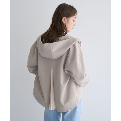 プリーツ生地でコンシャスに仕上げたバックスタイルが目を惹くジップアップフーディー。