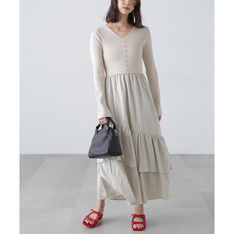 1枚でコーディネートが完成するドッキングワンピース。トップス部分はリブ編みニットでスッキリとさせ、スカート部分はややシボ感のある布帛生地を使用したフリルティアードスカート(裏地付き)です。襟は、小粒ボタンをポイントにしたVネックと、デコルテを綺麗に見せてくれるボートネックの2wayデザイン。袖口スリットにボタンを付けてポイントに。ドッキング部分はオールゴム仕様なのでストレスフリーな着心地です。着るだけで決まるワンピースなので、シューズや合わせる小物などで雰囲気の変化を楽しめます。※モデルの着用画像の場合、光の当たり具合により、実際の色味と異なって見えることがございます。色味は、商品単体の画像をご参照ください。