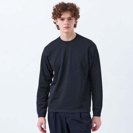 抜け感のあるオーバーサイズ長袖Tシャツです。背中をスプリットヨーク(ヨークの背中心を境に2つに割り、斜めに伸びるという生地の特性を活かし、仕立てた仕様)に、袖の切り返しはフリーダムスリーブ(脇の下に縫い目が無い仕様)といった動きやすいデザインを採用。ジャケットを上に着ても、ジャケットの襟元が直接肌に当たらないようネックラインを高めに設計しています。
