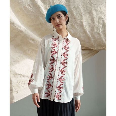 [型番:IGW-5104-2025]ウズベキスタンのタイルや陶器をイメージした柄の刺しゅうが魅力なレディースシャツ。薄手のコットンレーヨン素材で、さらりと着られるシンプルな形が魅力。羽織としても使える一品。