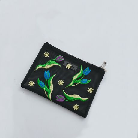 ハリのある丈夫なチュールにお花モチーフの刺繍を施したポーチ.