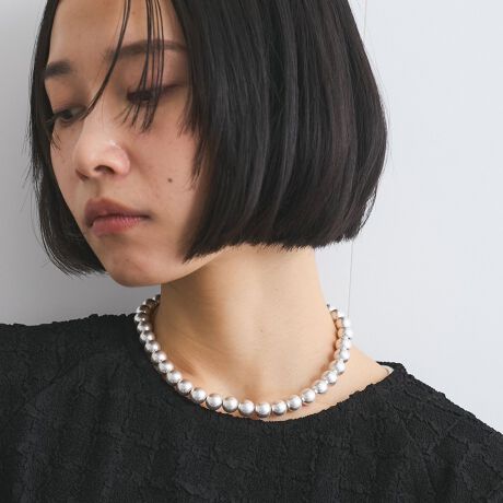 すこし大きめなサイズのボールチェーンがボリューム感あり、旬な雰囲気に。