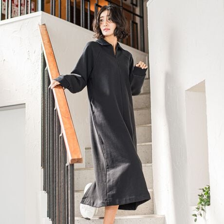1枚でコーディネートが完成する裏毛ロングワンピース。