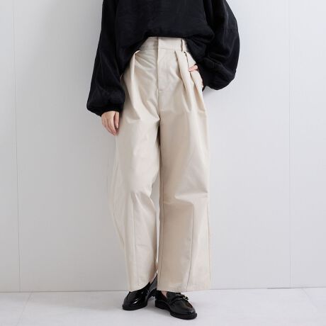 カジュアルなスタイリングに便利なチノパンツもハリ感のあるテキスタイルを使用し、2タックデザインとほのかにカーヴィーなシルエットで構築的な程よくモードなルックに。