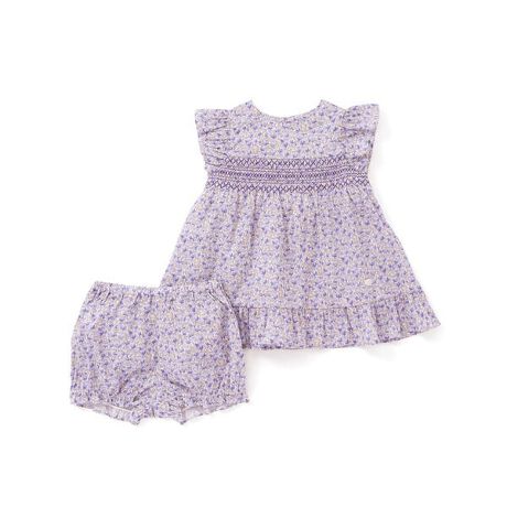 リバティプリントの花柄を使用したブルマ付きの女の子ベビー用ワンピース。