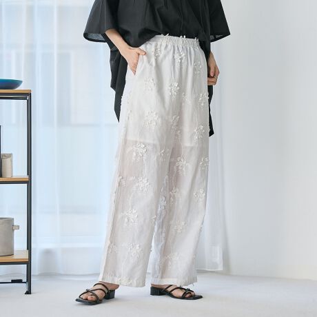 フラワーモチーフの刺繍とゆったりとしたシルエットで、夏らしいリラックス感を備えたワイドパンツ。