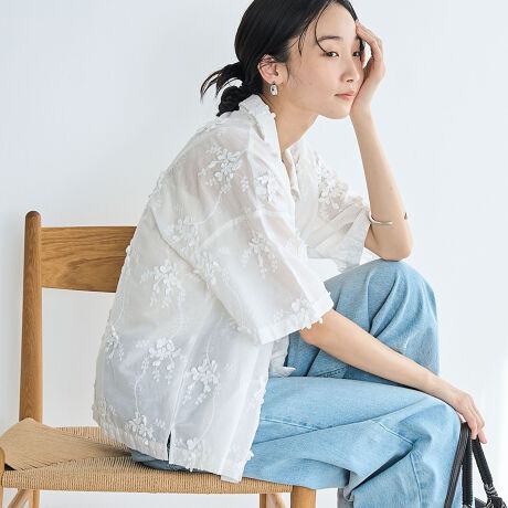 ≪新色登場!≫フラワーモチーフの立体刺繍が1枚で主役になる半袖シャツ