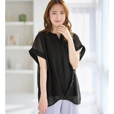 表地は上品な透け感のあるシフォン素材、裏地には暑い時期でも快適な綿混カットソー素材を使用しています。