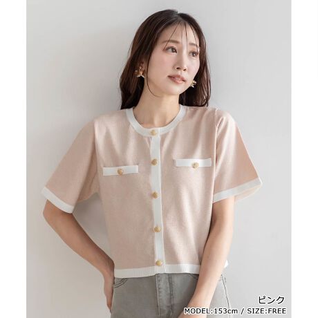 クラシカルなゴールドボタンがアクセントになる半袖カーディガン。