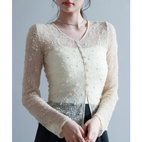 綿あめのようなシアー感がおしゃれなタイトシルエの総レースカーディガン。