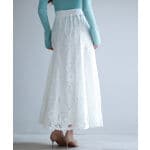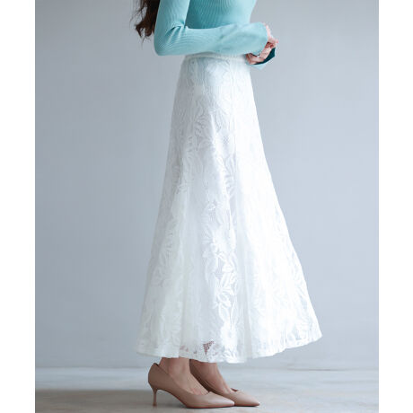 フレア裾が華やか見えする花柄総レースのロングスカート。