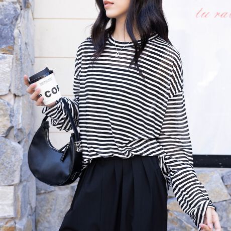 ボーダー柄がチャームポイントのゆったりロング丈の長袖Tシャツが新登場!
