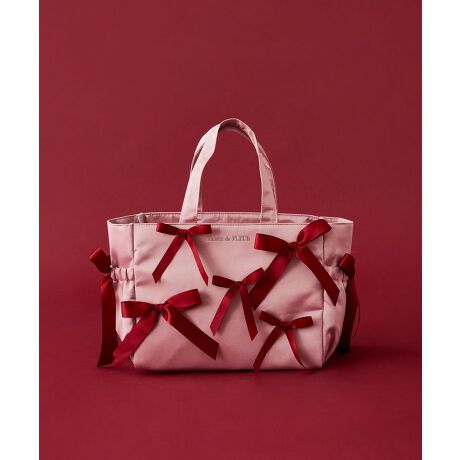 ピンク×レッドの配色がガーリーなシリーズが登場♪サテンリボンをたくさん散りばめたガーリーなサイドポケット付きトートバッグ。