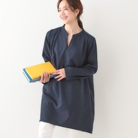 首元をすっきり女性らしく見せてくれるキーネックのデザインです。