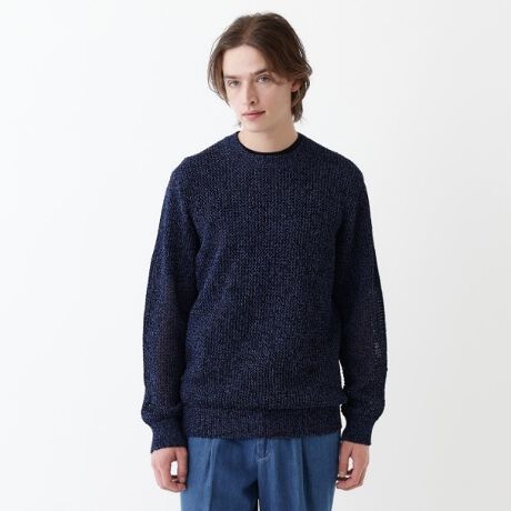 紙のようなさらりとした春らしい清涼感ある風合いに加工したペーパーライクヤーンと、伸縮性を良くし、シルエットの崩れを抑え軽減するストレッチヤーンを混合してプルオーバーニットに編立ています。
