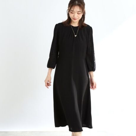 裾の広がりを少し抑えたエレガントなフィット&フレアーのシルエット、袖はレースとシフォンの二重にして透けが気にならない仕様にしています。