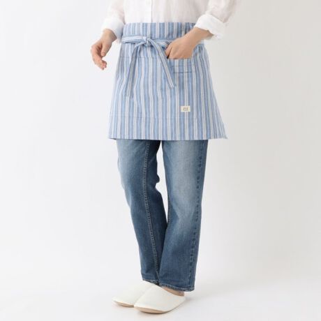 大きなポケットのついたショート丈のカフェエプロン。足さばきも良いので、家事だけでなく、DIY ガーデニングにもおすすめです。