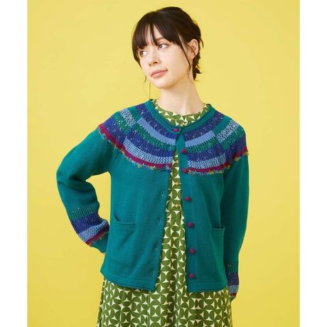 ホコモモラならではの配色が目を惹くカーディガン。ラグランスリーブとゆとりのあるシルエットで快適な着心地を実現します。襟周りのメッシュ編みが軽やかで、デザイン性の高い配色ボーダーがお顔周りを華やかに演出。袖は丸みがあり柔らかい印象に、袖口はリブですっきり見えも叶えます。身頃の切り替えと袖部分に使用しているファンシーヤーンや配色くるみボタンにも注目。嬉しいポケット付きです。クラフト感たっぷりなカーディガンは褒められる事間違い無しの一着です。