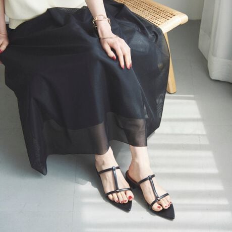 ・華奢なTストラップとシャープなポインテッドトゥが抜け感を演出