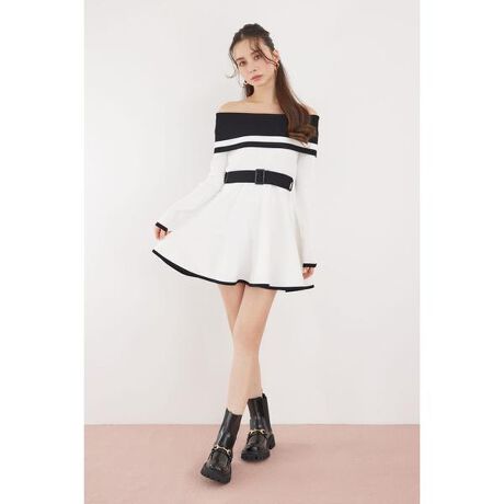 バイカラーオフショルフレアミニニットワンピース