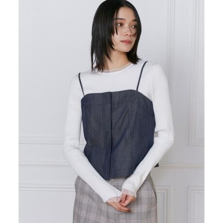 こなれ感あるレイヤードスタイルを叶えるデニム風ビスチェ。軽やかでカジュアルすぎないデニム風素材を使用することで、品のある大人カジュアルスタイリングを叶えます。シャツやブラウス、シアーカットソーなどとのレイヤードスタイルがおすすめです。比翼仕立ての前あき仕様、後はゴムを通しているため楽にお召しいただけます。ストラップは取り外し可能です。・裏地あり・アジャスター調節可・ショルダーストラップ取り外し可・後ろゴム仕様・前ボタン開閉可・水洗い可セットアップで着られるスカート品番:7151152012■サンプル撮影商品■こちらの商品はサンプルでの撮影となっております。実際の商品とは、サイズや色味、素材、デザイン等の仕様が若干変更になる場合がございます。