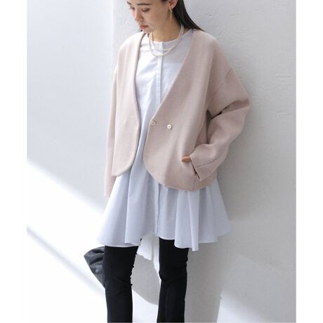 ノーカラーのスッキリとしたネックラインは、ボウタイ等の襟コンシャスなトップスとの相性も抜群。