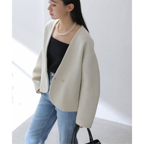 ノーカラーのスッキリとしたネックラインは、ボウタイ等の襟コンシャスなトップスとの相性も抜群。
