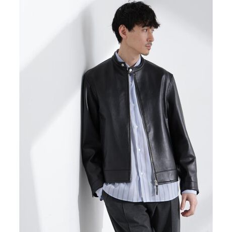 バンドカラータイプのシングルライダース。ドット釦やシングルライダースが大人のレザースタイルを実現させるアイテム。