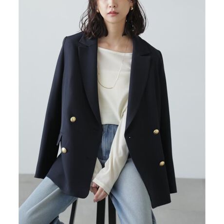 マニッシュな雰囲気のジャケット。スタンダードなダブルブレストで、肩まわりや身頃がすっきり見えるよう拘ったシルエットです。少し大きめなカラー(襟)もポイント。後ろはベンツスリット入りで動きやすく羽織り心地も良いです。※モデルの着用画像の場合、光の当たり具合により、実際の色味と異なって見えることがございます。色味は、商品単体の画像をご参照ください。