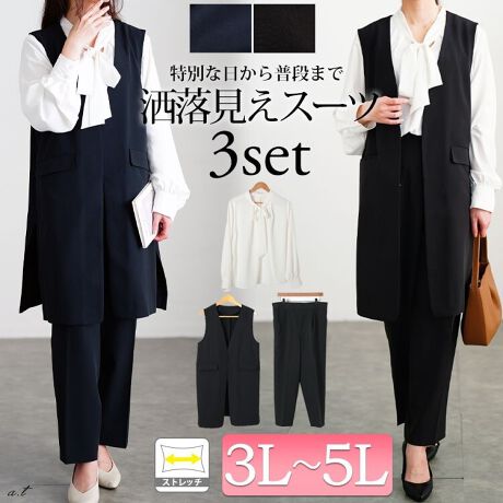 【大きいサイズ】 ロングベスト&ボウタイブラウス&テーパードパンツスーツ3点セット 大きいサイズ 冬