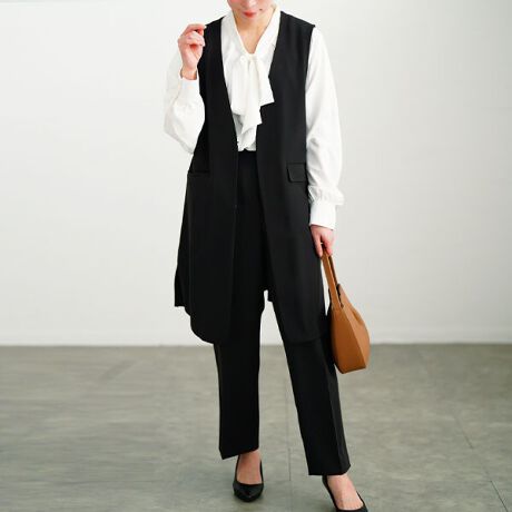特別な日から普段までさまざまなシーンに活躍する3点セットスーツ。羽織るだけで洒落見えするロングジレは、体型カバー&スタイルアップ効果◎美脚&脚長見えするテーパードパンツに華やかな印象のボウタイブラウス。そのままのセットで着用するのはもちろん、合わせるインナーで印象が変わりオールシーズン着回せます。ノーストレスのスーツはお仕事はもちろん、セレモニーシーンなど大人のきちんとシーンに大活躍すること間違いなしです。