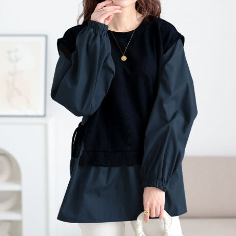 忙しい日も着るだけで簡単!フェイクレイヤードチュニックです。ベストを重ね着したようなお洒落デザインがこなれ感を演出。ベストはサイドリボン付きでお好みの長さに結ぶことができます。ドッキングしているシャツ生地はさらっとした肌触り。ブラウジングしやすいゴム袖口、二の腕をカバーするボリューム袖もポイント。オンオフ使えるカラーのお洒落チュニックはこれからの季節に活躍してくれます☆