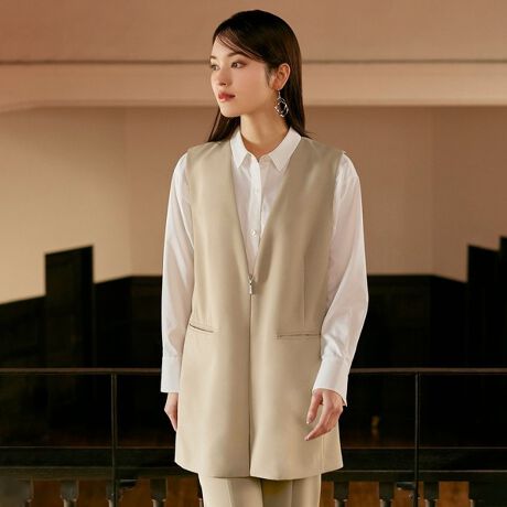 ミニマムなデザインで万能なベーシックジレ。カットソーやデニムパンツと合わせた、大人カジュアルスタイリングがおすすめです。加えて、同素材のボトム(U5R04521)と合わせれば、お食事やお出かけにぴったりな品のあるスタイリングも可能です。