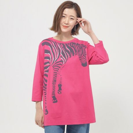 [型番:U7P05522__]【L】【ウォッシャブル】ゼブラバックプリントチュニックカットソーこちらはラージサイズです。アーカイブのオリジナルゼブラ柄をプリントした7分袖チュニックです。ヒップの隠れるレングスで、安心感のあるトップスです。【素材】定番の綿100%の天竺素材を使用。40番手の糸を2本撚りあわせたコーマ糸を使用し編み上げ、毛羽が少なくしなやかな優しい風合いが特徴です。(春夏展開商材)