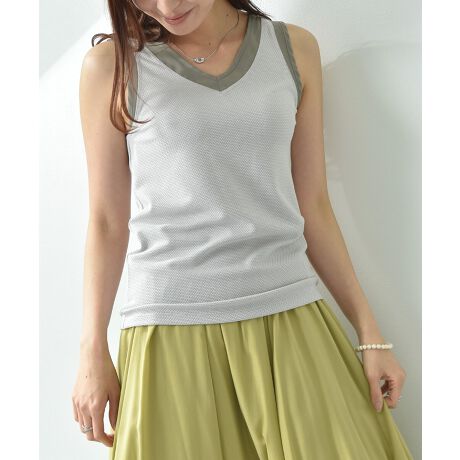 シアーがチラリと見えるだけでコーディネイトに華やかさをプラスしてくれます。ラウンドネックとVネックの前後2WAY仕様で、ネックの開いたカットソーやワンピース、シャツのインナーとして活躍◎また、夏に向けてリネンやコットンとも相性が良く、アウトドアやフェスなどの野外イベントでも目を惹くお勧めな1枚です。