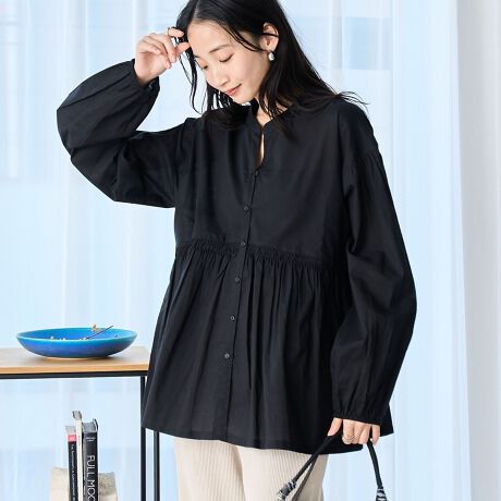 バルーンシルエットのお袖、柔らかなウエストシャーリングで女性らしいデザインのチュニックブラウス
