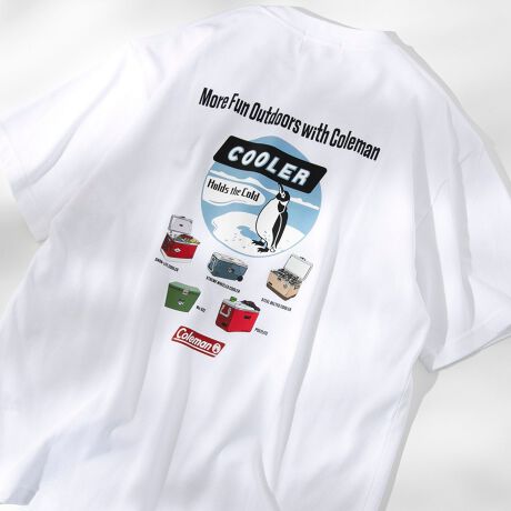 バックに涼し気なペンギンとコールマンのクーラーボックスがプリントされ、アウトドアの楽しさを演出したプリントTシャツ。