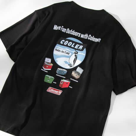 バックに涼し気なペンギンとコールマンのクーラーボックスがプリントされ、アウトドアの楽しさを演出したプリントTシャツ。
